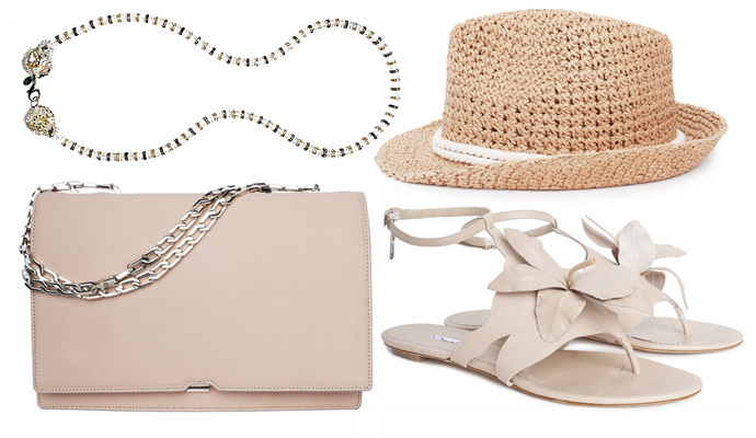 Necklace Erickson Beamon, clutch Victoria Beckham, sandals Oscar de la Renta, Eugenia Kim hat